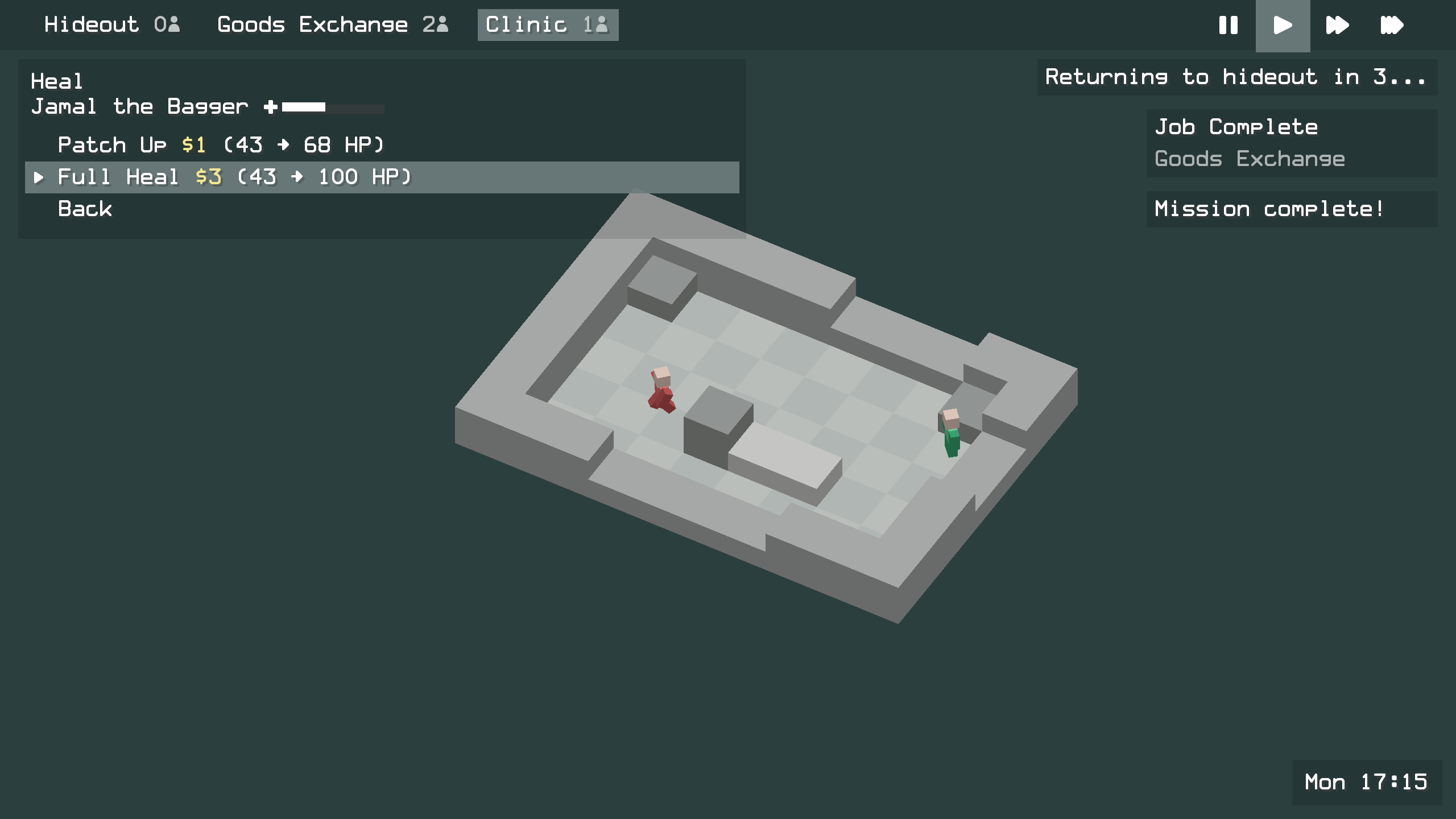 Combat takes its toll. Health doesn't recover on its own. The Clinic patches up your crew at a cost. A beaten-down thug is a liability. Keep them healthy or leave them behind.