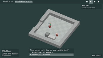 Your hideout is home base. From here, browse incoming job offers, check your roster, and head into the city. Jobs come in throughout the day—collection runs to shake down local businesses, goods exchanges to move product, or riskier operations that pay better but demand more. Select your crew carefully: up to four thugs can deploy on any job, but sending wounded or unmotivated members is asking for trouble. Navigate menus with the arrow keys, confirm with Space or Enter. Use Shift + number keys to switch between locations in the toolbar.